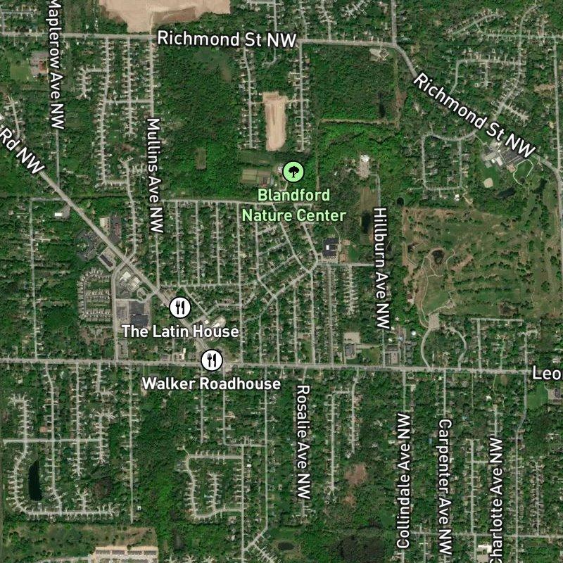 Most people hear "platted subdivision" and picture something generic, but Leonard Place—77 acres tucked into Richmond-Oakleigh—reads more like a quietly confident neighborhood than a tract development, with quarter-acre lots that feel genuinely spacious and homes running around $275K. Downtown Grand Rapids is just 13 minutes away, which means you get the breathing room without the distance, and the airport sits 30 minutes out if you need it. A restaurant is a three-minute walk, though a dozen more dot the mile radius around you, while Blandford Nature Center is close enough for a morning expedition—eight minutes on foot through established streets lined with mature trees. Grand Rapids Public Schools serves the area, and that proximity to actual green space, actual walkability to food, and that mid-century-forward housing stock is what keeps people rooted here long-term rather than using it as a stepping stone.