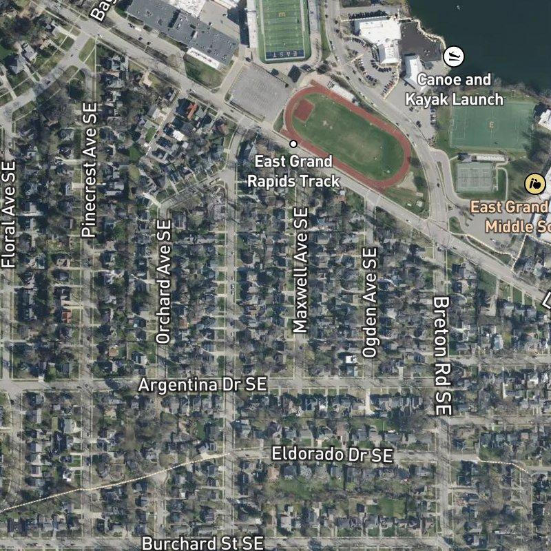 The lots here are small—a shade over a quarter acre each—which means the 27-acre subdivision reads more like a compact urban insert than sprawl. You're ten minutes from downtown Grand Rapids, with a transit stop steps from home and ninety restaurants within a mile, so the car stays parked more often than not. Homes run around $669K and sit in the East Grand Rapids Public Schools district. John Collins Park is an eight-minute walk away, and Reeds Lake sits less than a mile off, which gives the tight grid actual breathing room. The subdivision anchors the Albert-Realtors Hall St. Sub. Area, where errands and dining are both walkable and the nearest coffee shop is four minutes on foot.