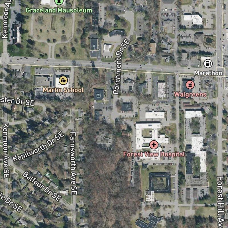 Mcalear Plat sits just east of downtown Grand Rapids—close enough that you're 11.6 minutes from the center, but far enough that the subdivision itself feels removed from the city's rush. The 7-acre plat is anchored by Forest Hills Public Schools, and everyday essentials cluster nearby: a grocery within a 5-minute walk, a restaurant within 7, and eighteen dining options scattered across the first mile. Hidden Lake lies 1.7 miles south, Gerald R. Ford airport 14 minutes away. Homes here run in the mid-$300s to low $400s, and the neighborhood has the steady feel of somewhere that works for people who want access without constant motion.