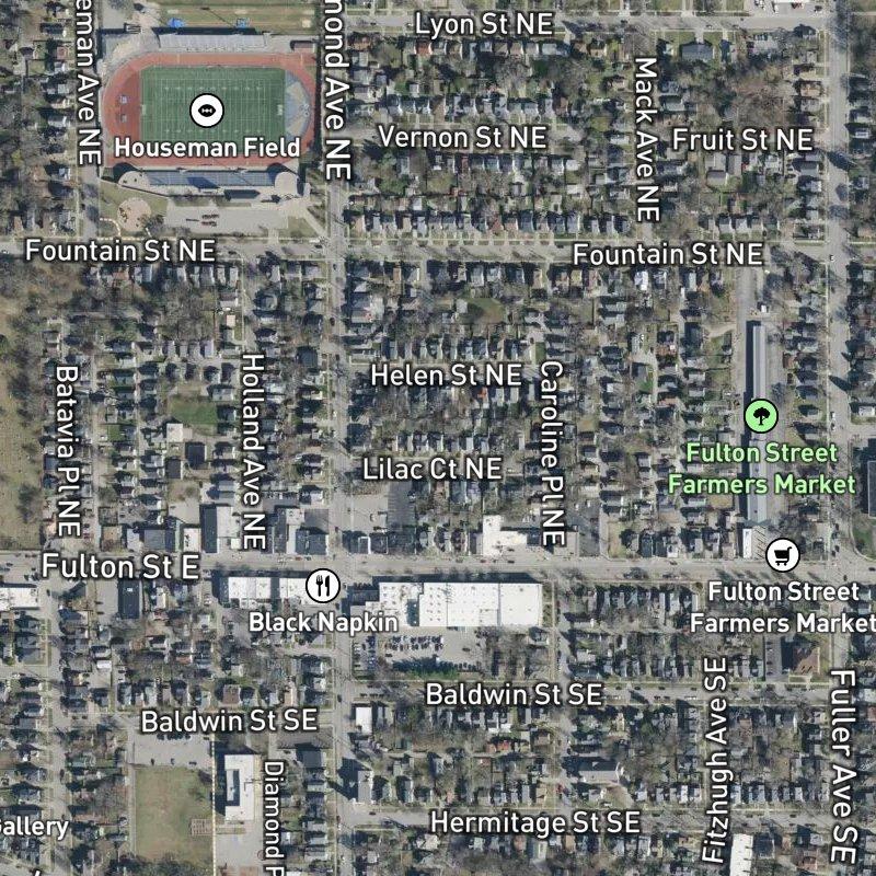 Seven acres of early-20th-century homes wedged into Midtown, where you're roughly four minutes from downtown Grand Rapids but surrounded by the kind of block density that makes stepping outside feel like an event—the Fulton Street Farmers Market is a three-minute walk, restaurants number in the hundreds within a mile, and transit stops are practically on your doorstep. Median home values hover around $272K, and the lots themselves are modest (about a tenth of an acre), which means the architecture—Queen Annes and American Foursquares—reads intimate rather than sprawling. Grand Rapids Public Schools serves the area, and if you're heading to Gerald R. Ford Airport, plan on twenty minutes or so. The neighborhood's real draw isn't space; it's proximity—to coffee, to groceries, to eighteen parks within walking distance, to the kind of street life where you'll actually see people on the sidewalk.