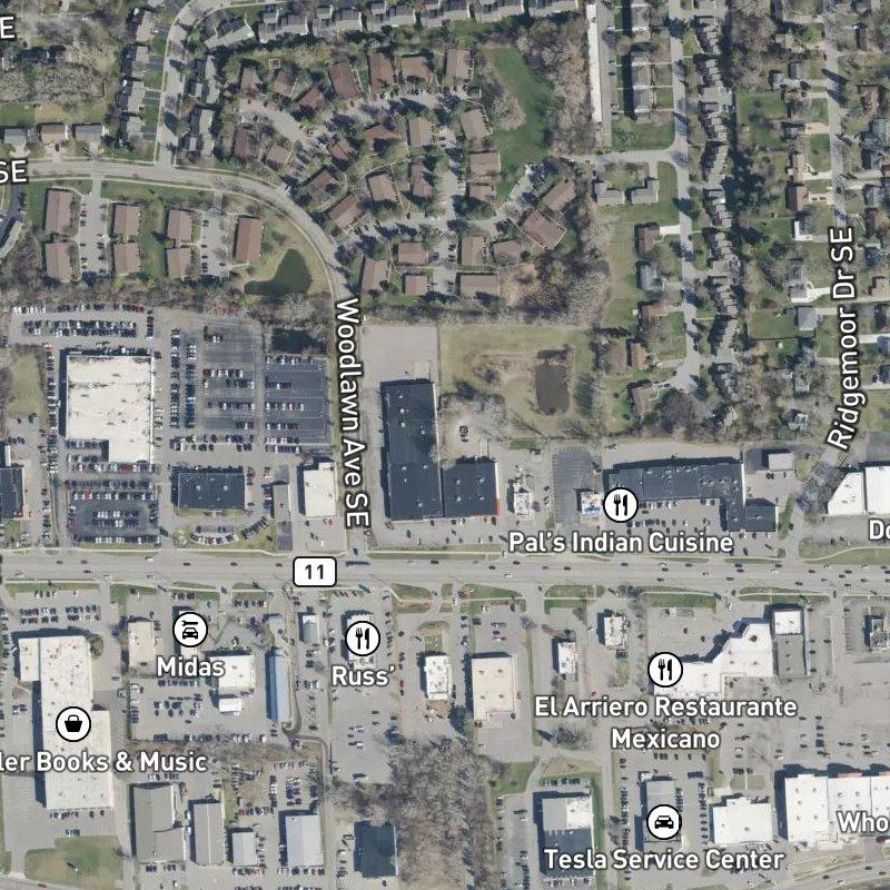 You sit in Ridgemoor Park, a tree-lined neighborhood in Grand Rapids where colonials and ranches from the mid-20th century line streets under a canopy of mature oaks and maples. The area rolls gently toward downtown, about fourteen minutes south by car, with the Gerald R. Ford Airport even closer at just under twelve minutes north. It's the kind of place where you can see the neighborhood's bones—solid homes on spacious lots, well-kept yards, and real sidewalks that have been here longer than most subdivisions have existed.