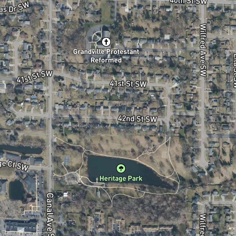 ...it's a straightforward ten-acre subdivision with quarter-acre lots where homes run around $327K. The blocks are tight enough that you can walk to a grocery in about ten minutes and grab a meal in four, which matters more than you'd think when you're living here day to day. Heritage Park is just a two-minute walk, and there are over 168 restaurants within a mile if you're not cooking. Transit is five minutes on foot, and downtown Grand Rapids sits about fifteen minutes away by car.