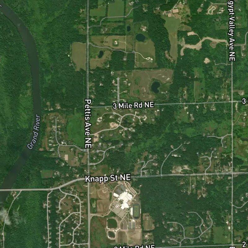 —so what you're really getting here is land. Eighty acres carved into sprawling lots, each one running around two acres, which means actual space between you and the next driveway—the kind of breathing room that doesn't materialize in most residential corners. Homes here run around $2.1M, and that price reflects the acreage more than anything else; you're buying the property, not the proximity to shopping. Groceries and restaurants sit about three miles out, which matters if you're the type who walks to dinner, but it also means the whole development has a genuinely removed quality—not isolated, just deliberate about its distance from strip-mall convenience. Downtown Grand Rapids is a straightforward 17 minutes away, and Gerald R. Ford Airport clocks in at just under a half-hour drive, so you haven't actually severed your ties to the region, you've just chosen to live outside its immediate orbit. The Knapp Street Bridge Boating Access Site is less than a mile away, which tells you something about the water access and recreational bent of the place. Forest Hills Public Schools serves the area, and the parent area has the infrastructure to support it, but the real draw here is the land itself—the kind of lot size that lets you actually own something without feeling like your neighbor's breakfast is happening in your living room.
