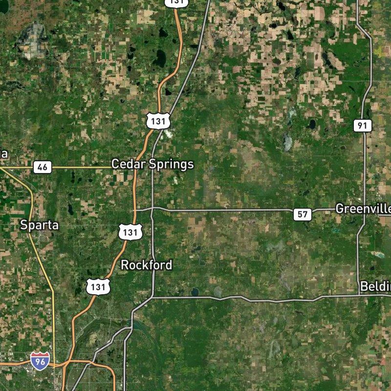 The modest ranch homes scattered across this corner of Courtland township sit on land that feels genuinely spacious—7,968 acres of it—with a restaurant within a three-minute walk yet six more dining options within a mile, which is the kind of balance that only works in a place that hasn't densified. Homes here run around $360K, and Cedar Springs Public Schools serves the area. Downtown Grand Rapids sits about 28 minutes south, close enough for work but far enough that the township keeps its rural character, with Courtland Township Park just over a mile away if you need a formal trail rather than the quiet roads themselves. A grocery store lies under two miles away, coffee shops a mile and change—the daily errand distances in a place where you'll actually drive them rather than pretend to walk them.