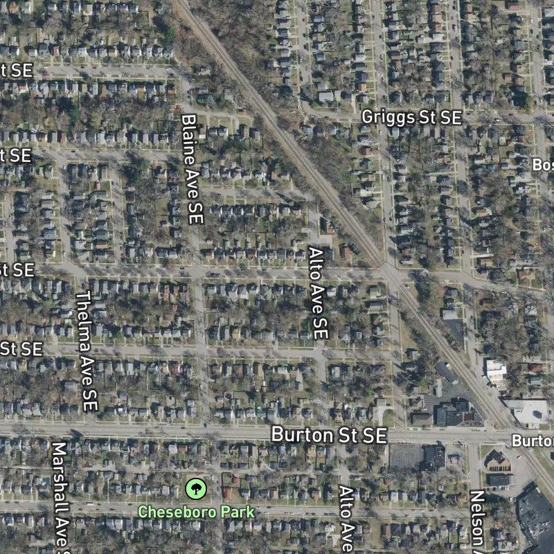 ...so you're looking at a nineteen-acre subdivision with Cape Cod homes laid out on quarter-acre lots, the kind of place where you can actually see the bones of the street plan. Cheseboro Park is a four-minute walk away, and there are eleven parks within a mile if you need that kind of variety. Downtown Grand Rapids is ten minutes north; the airport is about eighteen. Homes here run around two hundred fifteen thousand.