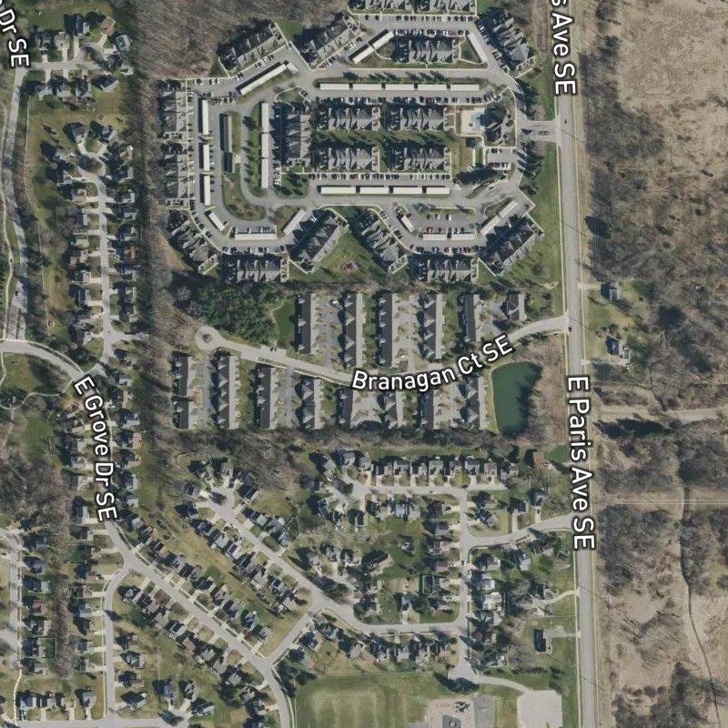 It's a newer condo development—2014-2016 construction—spread across 15 acres in Kentwood, just south of 52nd Street off East Paris Avenue. The units themselves are straightforward: two and three-bedroom layouts with open floor plans, zero-step entries, attached garages, and the kind of functional design that doesn't ask you to work around the building. Some have finished basements and sunrooms with decks; others are positioned as end units with a bit more light. You're looking at around $379K for a median sale here. Kentwood Public Schools serves the area. The location does the heavy lifting—Gerald R. Ford airport is 6.6 minutes away, downtown Grand Rapids about 21 minutes, and there are 18 restaurants within a mile, plus a coffee shop and grocer both around 2.2 miles out. East Paris Nature Park is a 9-minute walk if you want to move without driving, and there are three parks within a mile total. It's the kind of place where you're not fighting traffic to get anywhere useful, and the development itself keeps its grounds manicured without demanding much personality or upkeep from you. Nothing flashy, nothing cramped—just condos built recently enough that you won't be wrestling with systems from 1987, positioned where you actually want to be.