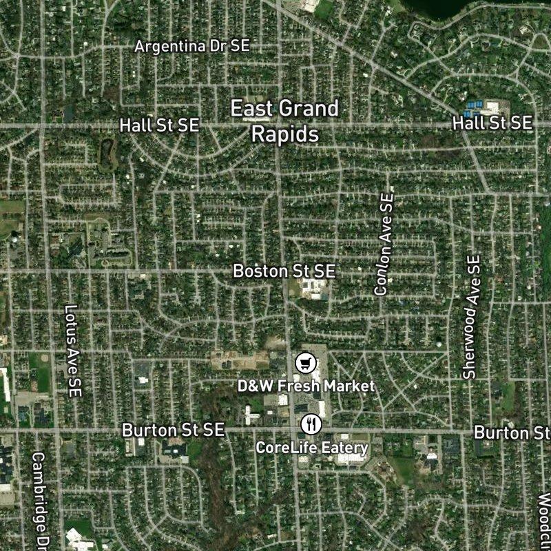 You'll feel the suburban ease the moment you pull in—tree-lined streets, ranch homes in brick and aluminum siding spread across 109 acres, the kind of place where you're never more than a few minutes from what you need. A grocery run is a quick walk away, and there's a restaurant within two minutes if dinner at home isn't happening. The East Grand Rapids Public Schools district serves the area, and downtown Grand Rapids sits just under 13 minutes north by car. Homes here run around $492K, and the proximity to the Albert-Realtors Hall St. Sub. Area keeps you connected to the broader region—plus you're only about 16 minutes from Gerald R. Ford airport. There are 96 restaurants within a mile and a transit stop practically at your doorstep, and if you're after green space, Cambridge Park is less than a mile away, with Reeds Lake another mile or so beyond that.