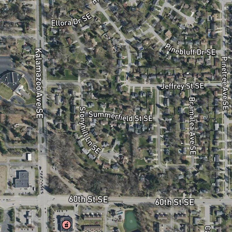 The driveway slopes gently downward as you pull in, and suddenly you're surrounded by 20 acres of quietly manicured streets—the kind of place where the houses speak for themselves and the lawns do too. Pennybrook Farms sits within the Bentbrook Estates Area, a platted subdivision where homes run around $370K and the proximity to amenities doesn't require much faith. A grocery is a six-minute walk away, there's a restaurant around the corner, and a transit stop sits practically at the edge of the property—which means downtown Grand Rapids is about 17 minutes by car, and Gerald R. Ford airport lands at 12 minutes. The neighborhood feeds into Kentwood Public Schools, and if you need green space, Pinewood Park and two other neighborhood parks are within a mile, with 96 restaurants scattered in a one-mile radius. It's the kind of subdivision that doesn't try too hard: decent bones, solid access, and the kind of quiet that comes from knowing exactly what you're getting.