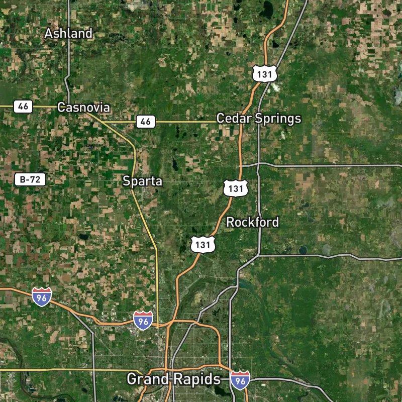 Sunrise here hits different—the light spreads across open land before the day gets busy, and that's when you see why people choose this. About 10 miles north of Grand Rapids, the Pine Island Dr & Algoma Ave area feels rural without feeling remote; a 23-minute drive gets you downtown, and the Rogue River runs through it, giving the whole place a quiet anchor. Homes cluster around ranch-style builds and run around $495K, which buys you real acreage—the neighborhood spans nearly 8,000 acres across Sparta Area Schools territory. You're steps from a coffee shop and restaurants (24 within a mile), a three-minute walk to groceries, and Chalmers Park is a 13-minute walk if you need it; eight parks sit within a mile. If the water matters, the Rogue River boat launch is about 1.6 miles out. It's the kind of place where you get space to breathe but don't have to drive an hour for dinner—suburban enough, but not quite.