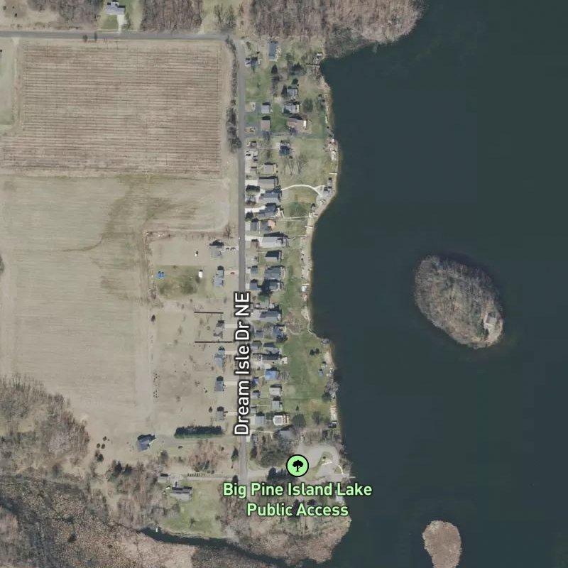The boat launch is practically your front yard—just a five-minute drive, or even closer if you're willing to walk. Pine Island View Park sits on 17 acres of platted land in the Byrne Park Area, where lots average about half an acre each, and homes run around $529K. Big Pine Island Lake is less than half a mile away, which means you're genuinely in lake country without feeling remote; downtown Grand Rapids is about 36 minutes if you need the city. Kids attend Belding Area School District schools. The subdivision's real draw is that proximity to water and access—you can be on the lake or walking to the public access point in minutes, not hours.