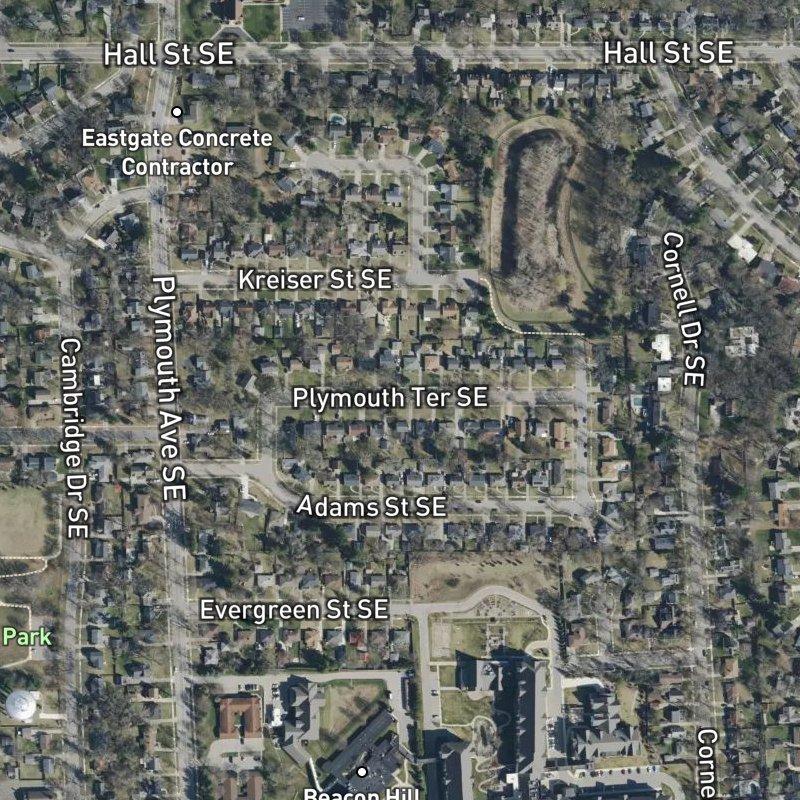 Just off East Beltline, Plymouth Terrace spreads across 10 acres of tidy residential blocks where ranch and midcentury homes sit on quarter-acre lots with room to breathe—about 11 minutes from downtown Grand Rapids when you need the city, but far enough out to feel removed from it. Homes here run around $398K, and the subdivision has the bones of a quiet, tree-lined neighborhood with Cambridge Park a five-minute walk away and Reeds Lake less than a mile and a half down the road. You're in Eastgate, which means real sidewalks, actual neighbors, and serious restaurant density: 84 spots within walking distance, plus coffee shops and grocery stores close enough that you don't need to plan a trip. Grand Rapids Public Schools serves the area, and if you're commuting to the airport, it's about 19 minutes. Transit access is right here—stops are practically on your doorstep.