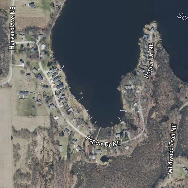Poplar Point sits on 23 acres of platted lots—modest by subdivision standards, each averaging just under a third of an acre—in the quiet stretch where Wabasis Avenue and 12 Mile Road intersect. Homes here run around $298K, which buys you reasonable space without the commute weight of closer-in developments; downtown Grand Rapids is a comfortable 36.6 minutes away. The real appeal emerges at the edges: Brown Lake sits just 0.4 miles off, close enough that water access feels like an extension of the property rather than a destination. A canoe launch at Wabasis Lake Park is less than two miles over, and Wabasis County Park offers trails and picnic grounds another mile beyond that. It's a subdivision that doesn't announce itself—no grand entrance, no clubhouse—just level lots, modest spacing, and proximity to water that makes the rural feel actual rather than theoretical.