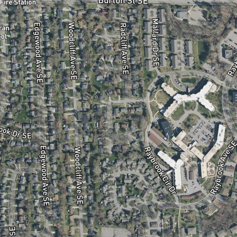Driving through Radcliffe Estates No.2 feels like moving through somebody's actual neighborhood—tree-lined streets, modest lots averaging a quarter-acre, homes in the $410K range that suggest people built here to stay. You're eight acres of platted single-family residential tucked into Ridgemoor, that tree-canopied corner of southeast Grand Rapids where the lots are generous and the mall (Woodland, over 100 stores) is close enough to reach without thinking about it. A restaurant is a six-minute walk away; the nearest grocery store a thirteen-minute one; transit a three-minute walk. Downtown Grand Rapids sits 15 minutes south, Gerald R. Ford airport 13 minutes northeast—practical anchors that don't dominate the feel of the place. Grand Rapids Public Schools serves the area. Three parks within a mile, including Camelot Park less than a mile out. It's the kind of subdivision where you get space without isolation, walkable access without pretension.
