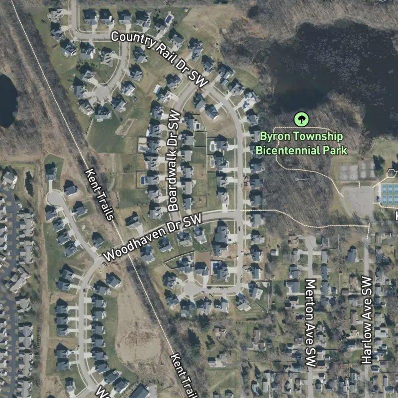 A tree line marks the eastern edge of Railview Ridge, where twenty-five acres of platted lots rise just outside the Byron Oaks area. The subdivision sits close enough to downtown Grand Rapids—twenty minutes by car—that you're not stranded, but far enough out that you get actual land. Byron Township Bicentennial Park is a four-minute walk, and there's a coffee shop three minutes away on foot; dining options number around forty-eight within a mile, so you're not cooking every night unless you want to. Homes here run around nine hundred eighty-five thousand dollars.
