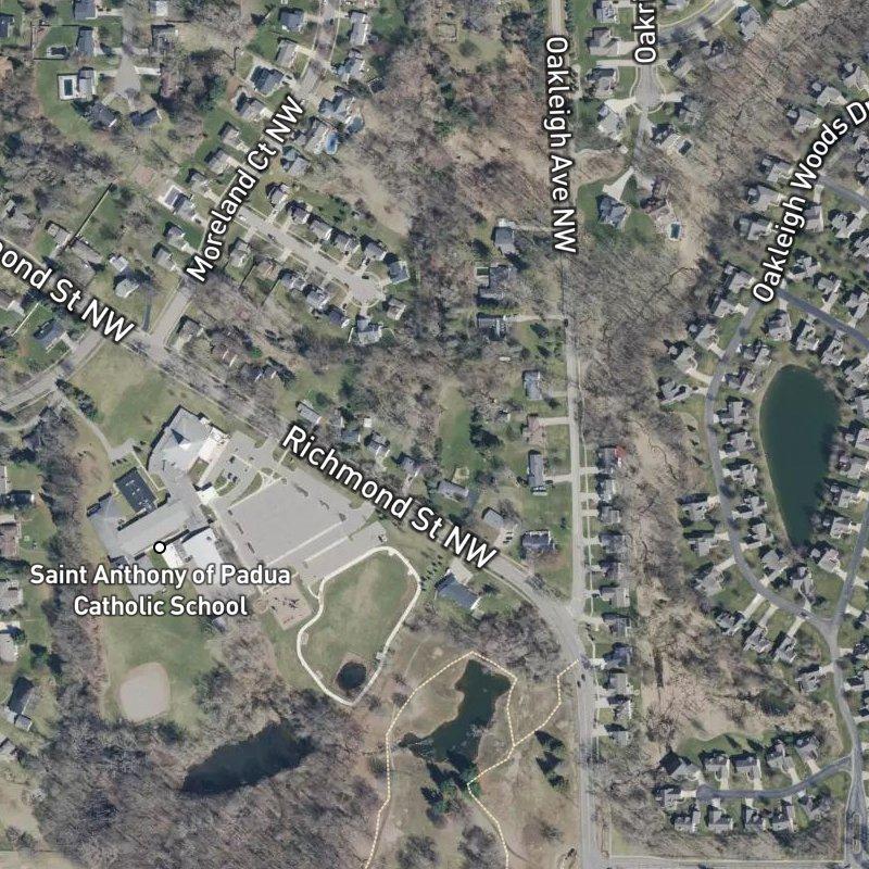Days here move at a different pace than further in—you're on the west side of Grand Rapids, where Ringelberg Plat sits as a 7-acre subdivision with lots averaging just over half an acre, enough breathing room that the street doesn't feel crowded but tight enough that you're not isolated. Homes run around $318K, and Grand Rapids Public Schools covers the area alongside private options. Downtown is about 12 minutes by car, which means you're close enough to grab what you need but far enough that the neighborhood stays residential—mature trees line the streets, and The Highlands park is a short walk away. Within a mile you'll find half a dozen restaurants and a grocery store; coffee takes a bit longer, but that's the trade-off for having actual land beneath your feet. The real anchor, though, is Richmond Park just outside your door—a public pool, sledding hill, and open space that defines the whole community's character.