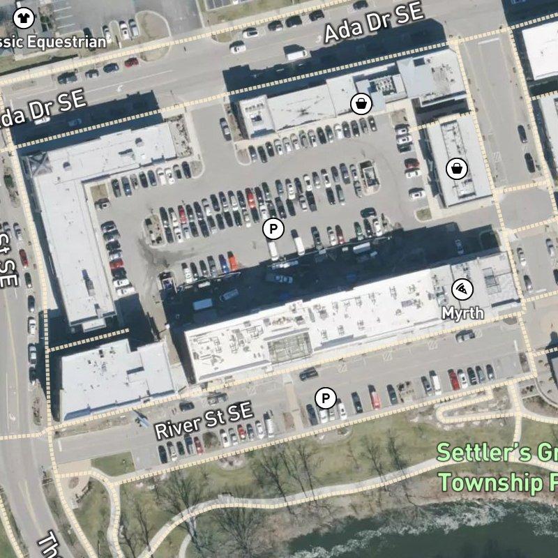Evening light hits this place best—when the sun catches the brick and the street settles into that golden hour before dinner. River Street Commons sits on four acres where Grand River Drive and East Fulton Street meet, close enough to grab groceries in two minutes on foot and steps from any number of restaurants, with 18 more within a mile if you're not in the mood for your usual spot. The location trades some errand convenience for genuine walkability to food, which is the right trade if you actually eat out. Downtown Grand Rapids is 16.7 minutes away, and Gerald R. Ford Airport another 20 minutes beyond that, so commutes are real but manageable. Settler's Grove Township Park sits right next door—the kind of thing you realize matters more once you live somewhere quiet enough to use it—and seven parks land within a mile, which adds up when you're counting green space. The nearest boat launch at Ada is half a mile off, if that matters to how you spend weekends. Homes here run around the mid-$300s, and you're in the Forest Hills Public Schools district. This is the kind of neighborhood where the bones of the street are what you're buying into: walkable-enough retail core, actual park access, and the river proximity without the downtown crush.