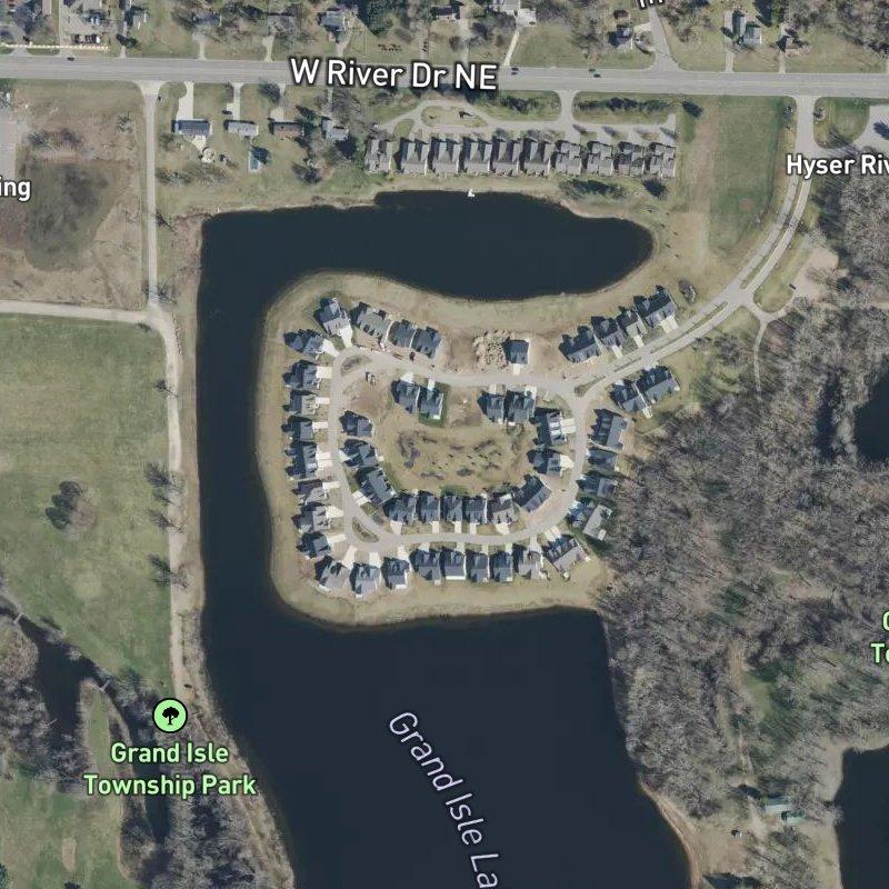 The pond hits you first—three sides of water, dark and still, ringed by the kind of woods that actually stays wooded in West Michigan. You're in Fingers Plat Area, just west of M-44, and the whole place has that low-key executive feel: patio homes and attached condos, 1,485 to 2,200 square feet, built by Eastbrook Homes (59 years in the business, which matters). Wide hallways, zero-step entrances—someone thought about aging in place without making it obvious. Homes here run around $166K, and Northview Public Schools handles the district. Downtown Grand Rapids is 16 minutes away when you need it, which is close enough without feeling like you live in the spray.