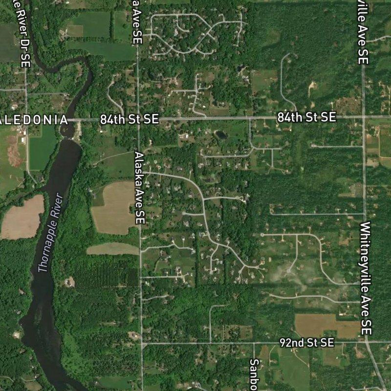 You're looking at 87 acres of established homes running around $1.1M, where the nearest restaurant is about a mile and a half out and the grocery options (six within two miles) mean you're not exactly roughing it—just far enough removed that you actually notice the land. LaBarge Dam Recreation Area is a twelve-minute walk if you want to move your legs, and Blodgett Lake sits about a mile away if the canoe itch strikes. The schools are Caledonia Community Schools, downtown Grand Rapids is twenty-eight minutes when you need it, and Gerald R. Ford Airport is close enough that you won't resent the drive. What you get is the kind of subdivision where the lots have room to breathe and the commute to the city doesn't feel like punishment—or like you're living in one.
