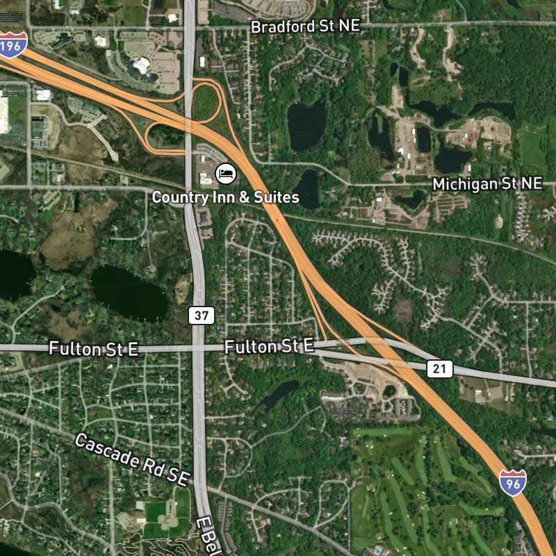 Early evening light softens the tree-lined streets of Robinhood, when the subdivision's 96 acres feel less like a planned grid and more like something organic—modest brick homes on third-acre lots arranged with enough breathing room to notice the oaks and maples. A coffee shop sits less than a mile away, and Hidden Lake lies just 0.4 miles from most addresses, so quick escapes to water or caffeine don't require much distance. Downtown Grand Rapids is 10.5 minutes south by car, while Gerald R. Ford Airport reaches in 15.2 minutes, which means the location threads a practical needle between urban access and suburban space. Two parks within walking distance—including Cascade Community Association Park—anchor the neighborhood's green infrastructure, and eighteen grocery stores within a two-mile radius make errands feel abundant rather than sparse. Forest Hills Public Schools serve the area, and homes here run around $406K, which on a third of an acre starts to make the math feel grounded rather than aspirational.