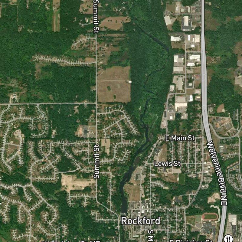 Lined with mature trees that frame views toward the Rogue River valley, Rogue River View Estates spreads across 54 acres of land just beyond the Heritage Park area north of Rockford. Homes here run around $450K and are anchored in brick and vinyl construction, with an unnamed park a short walk away and another 20 parks within a mile—the kind of density that means you're never far from green space. Rockford Public Schools serve the subdivision, and you can reach a restaurant on foot in about 10 minutes or grab coffee in 11. Downtown Grand Rapids sits 21.5 minutes south, while Gerald R. Ford Airport is roughly 36 minutes away, making the commute manageable without feeling rushed. Groceries, restaurants, and daily needs cluster reasonably close—a mile or so for the nearest grocer, 60 dining spots within a mile's radius—so the subdivision doesn't feel isolated even though it's anchored in open land.