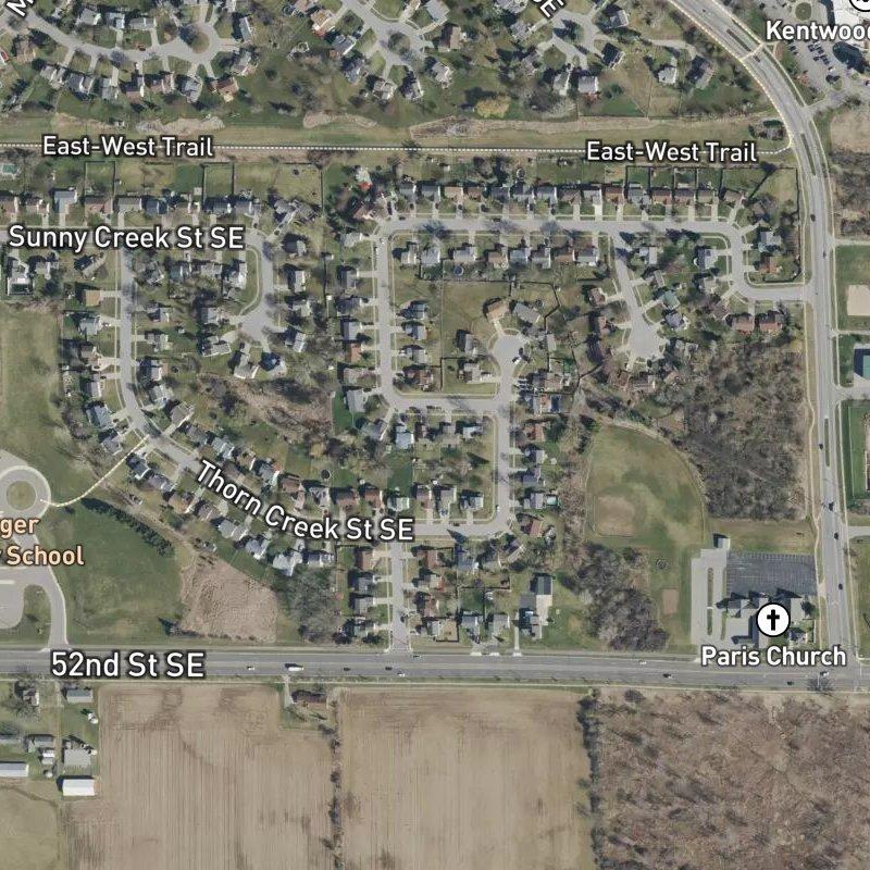 Rum Creek Estates No. 2 sits on 15 acres carved into neat quarter-acre lots, the kind of subdivision where the grid feels purposeful rather than cramped. You're close enough to Stauffer Station Park for a quick walk—eight minutes gets you there—and five more parks dot the mile around you. The nearest bus stop is a four-minute walk, which matters if you're heading downtown Grand Rapids in under 20 minutes or catching a flight from Gerald R. Ford in under nine. Restaurants cluster nearby; 18 sit within a mile, and groceries are plentiful at 36 stores within two miles, though the closest one takes a 13-minute walk. Homes here run around $324K and fall under Kentwood Public Schools, anchoring you in an area where the mix of walkable access and open space actually holds together.