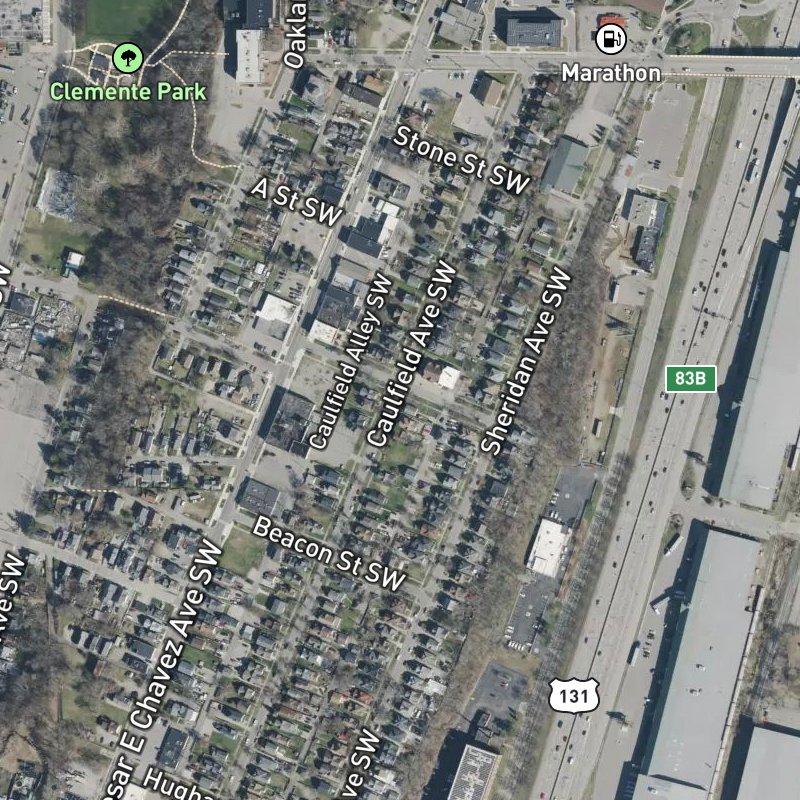 The Grand River is basically your backyard here—a five-minute walk to Clemente Park and you're looking at water, trails, and the kind of green space that makes a seven-acre platted subdivision feel less like a grid and more like something that actually belongs in Grandville. Homes run around $176K, which lands you in a spot with sixty restaurants within a mile, a coffee shop an eight-minute walk away, and transit steps from your front door—downtown Grand Rapids pulls in just over five minutes by car if you need it. Grand Rapids Public Schools serves the area, and if you're the type who'd rather spend your weekend on a kayak than in a car, Butterworth Park Launch is less than a mile away. It's the kind of place where you can stay compact and still get out.
