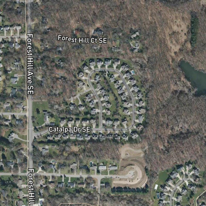 Ryann Ridge sits in the Vineyard Area, a corner of West Michigan where the horizon still breathes a little—close enough to downtown Grand Rapids that you're eleven minutes away, far enough that you feel the spaciousness. The place spreads across twenty-three acres of condo living, with lots that average three-tenths of an acre. Hidden Lake lies about a mile and a half down the road if you want actual water, and Forest Hills Park is a twelve-minute walk when you need grass and sky. Around you: a dozen restaurants within a mile, six grocery stores within two miles, and a coffee shop about two and a half miles out—the kind of proximity that means you're not stranded, but you're also not living on top of a mall.