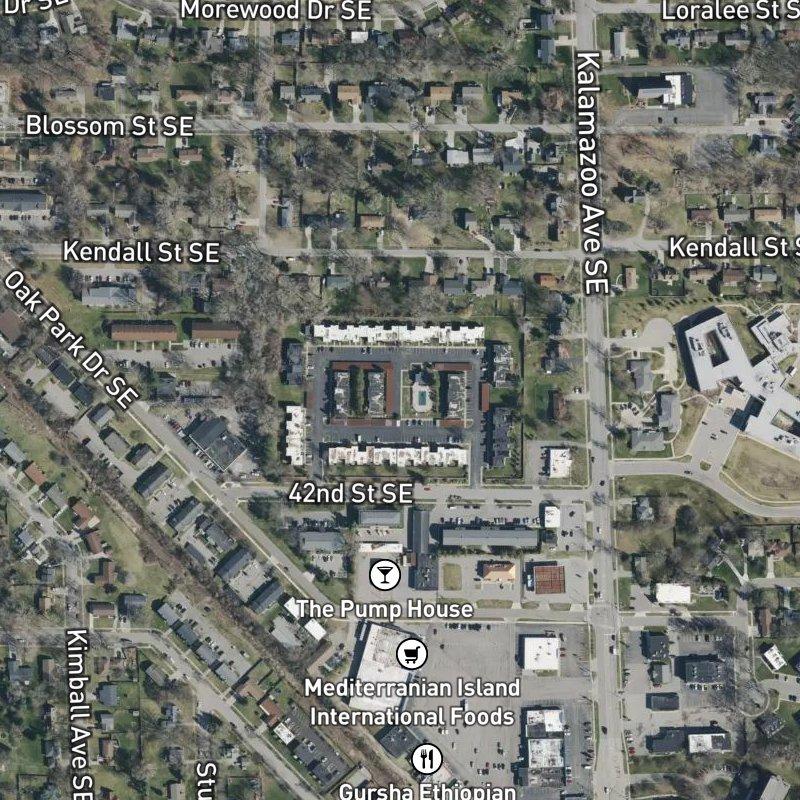 Within Saxony Village, your daily routine looks different because everything you actually need is close by—groceries a two-minute walk, restaurants right at your doorstep, and a transit stop just steps away. You're on eight acres in Ken-O-Sha Park, a southeast Grand Rapids neighborhood where the condo layout gives you the feel of ground-level living without the isolation. The area sits where the city transitions into Kentwood, surrounded by over eighty restaurants within a mile and more than three dozen grocery stores nearby—the kind of density that makes running errands feel natural rather than like an errand run. Downtown Grand Rapids is fourteen minutes away, and Gerald R. Ford International Airport is under fourteen minutes, so commuting doesn't eat your day.