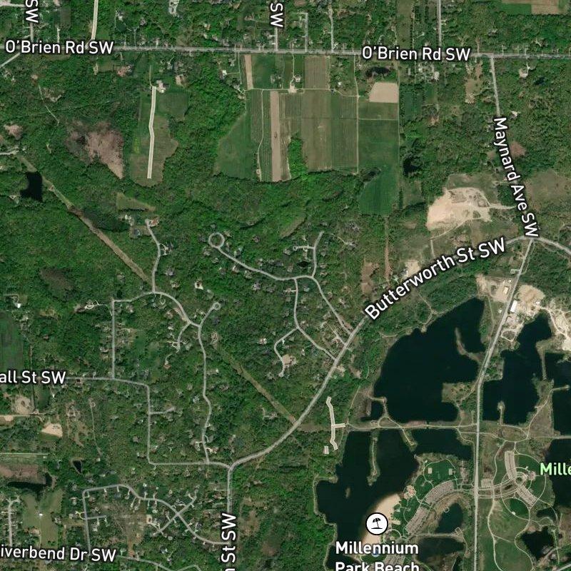 If someone asks what Serenity Ridge is like on the drive over, you'd tell them it's a hundred-twenty-four acre condo community where homes sit on nearly two acres each—so you've got actual land around you, not the usual shoulder-to-shoulder setup. The place is anchored in the D & B Plat Area, about thirteen minutes from downtown Grand Rapids, which means you're close enough to the city that a weeknight dinner isn't a production, but far enough out that your backyard doesn't feel borrowed. Millennium Park Lake is less than a mile away, and Harmon Park sits just over a mile down the road if you want a place to walk without leaving the area entirely.
