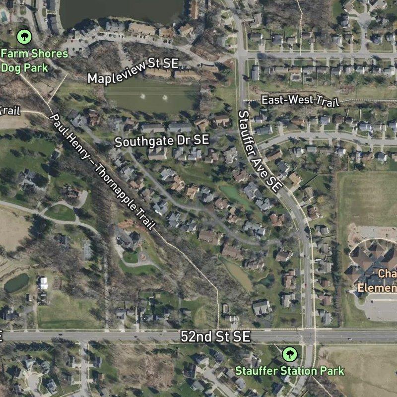 Southgate Condominiums spreads across twenty-two acres of ranch-style homes in the Crosswinds No.2 Area, anchored by two ponds that give the development its water-facing character. The community sits on generous lots—the average runs over twenty acres—which means actual space between homes rather than the compressed feeling of tighter subdivisions. Aluminum siding and stone construction dominate the architectural palette here, straightforward and practical. Stauffer Station Park lies just a four-minute walk away, and five parks total sit within a mile, so green space isn't hard to find. Downtown Grand Rapids is about eighteen minutes by car, while Gerald R. Ford airport is roughly nine and a half minutes—close enough that neither feels like a trek.