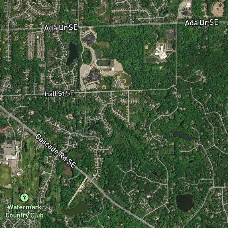 You'll find Stoneshire spread across 69 acres along Cascade Road, a quiet stretch of West Michigan that feels removed from the usual sprawl but doesn't require a commute to feel that way—downtown Grand Rapids is about 15 minutes away, and the airport's even closer. The condos sit on half-acre lots, which means you're not living on top of your neighbors, and the whole setup gives you room to breathe without feeling isolated. A grocery store is about a mile and a half down the road, coffee and dinner spots are similarly close, and if you want to get on the water, the Ada boat launch on the Grand River is just 2.5 miles out. The Forest Hills Public Schools district covers the area, and you're minutes from Carl Creek Wetlands Preserve if you're into walking trails. Homes here run around $1.1M, and they attract people who want the space and quiet of a low-density community without sacrificing access to the city's restaurants, amenities, and services—essentially the middle ground between a rural feel and urban convenience.