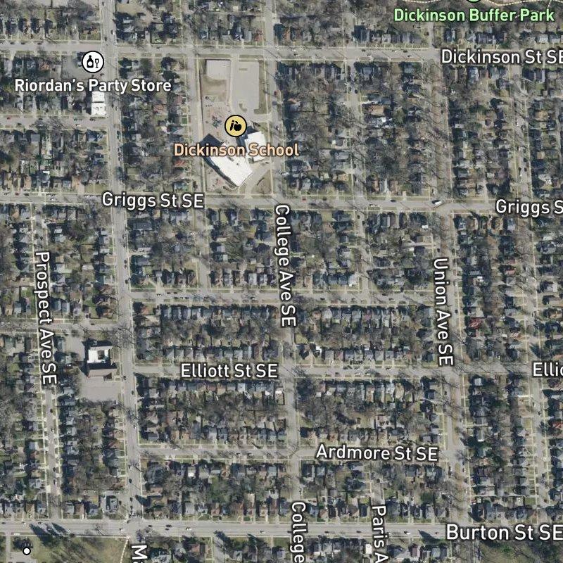 The moment you turn onto these streets, you notice the lot sizes—nearly three-quarters of an acre each on average, which means actual breathing room in the Southeast Grand Rapids grid. This 6-acre subdivision sits within the Seeds of Promise area, where a 23-year-old nonprofit has been quietly rebuilding the neighborhood one house at a time, and this plat reflects that steady work. Median home values hover around $255K, and you're eight minutes from downtown if the commute matters. Walking to a restaurant takes about seven minutes; groceries are ten; coffee requires a fifteen-minute stroll, but a transit stop is essentially at your door. Dickinson Buffer Park sits a five-minute walk away, and nine parks cluster within a mile—the kind of density that means kids don't need a car ride to play. Grand Rapids Public Schools serves the area, and if the water calls, Butterworth Park's boat launch is just over two miles south.