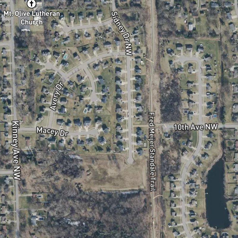 Summerbrooke Estates No.1 sits on 10 acres in the Maynard Acres Area, a 14-minute drive from downtown Grand Rapids, with Gerald R. Ford airport just under 31 minutes away. Lots average 0.30 acres—modest and manageable—and homes run around $575K. The subdivision sits within reach of serious retail and dining density: 132 restaurants and 18 grocery stores within a couple miles, though the nearest grocer is about 1.1 miles out and a restaurant sits roughly a 13-minute walk away. A transit stop lands within a 3-minute walk, and two parks are within a mile; Walker Community Park itself is a 12-minute walk. Students feed into Kenowa Hills Public Schools.
