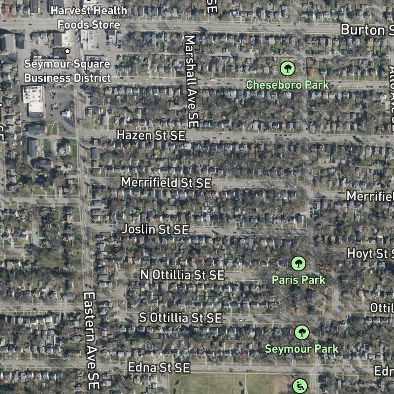 Mailboxes line Eastern Avenue where the street widens into the commercial heart of Alger Heights, and Sunrise Add. sits right at that intersection—nineteen acres where you can step out your door and reach a restaurant in seconds or catch the bus just as quickly. Homes here, mostly built between the 1920s and 1950s in bungalow and cottage styles, cluster on small lots (averaging 0.12 acres) in the kind of density that makes walking feel natural rather than forced. Grand Rapids Public Schools serves the area, and downtown is ten minutes away by car.