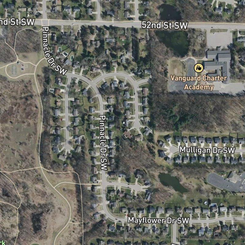 Tahoe Pines catches the light best at dusk, when the modest homes on this 12-acre plot glow against the sky and you can actually see why someone chose here. It's a small subdivision in the Country Charm Estates Area, where homes run around $477K and the whole setup feels less like a development and more like a pocket neighborhood—the kind where you're still close enough to reach downtown Grand Rapids in under 15 minutes but far enough removed that you're not hearing the noise of it. A transit stop is an 8-minute walk away, and Gezon Park sits even closer, with three other parks within a mile if you feel like getting out without the car. The nearest grocery and restaurant are both a 13-minute walk, and there are 132 restaurants within a mile—which means you've got options without the feeling of living in a strip. Vanguard Charter Academy serves the area, and if you're measuring your life in small, deliberate choices, this is exactly the kind of place those choices land.