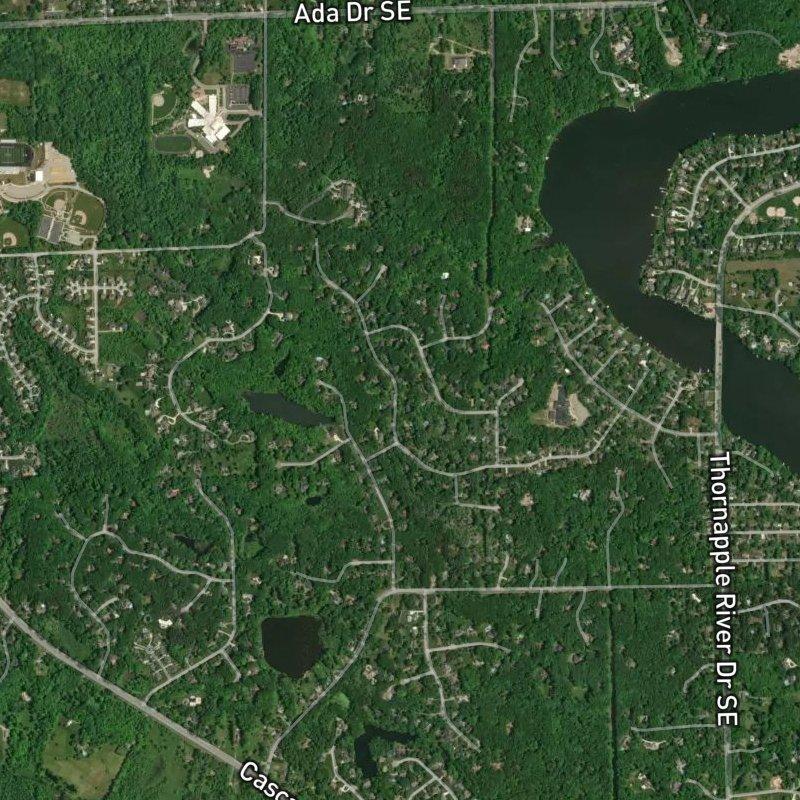It's got a surprising amount of land for a subdivision—97 acres spread across what feels like a real neighborhood rather than a cramped grid—and you're right in the pocket between downtown Grand Rapids and the airport, about 18 minutes to either one depending on traffic. Forest Hills Public Schools feeds the area, and there's enough going on nearby that you're not stuck: a coffee shop and a couple of restaurants are just over a mile away, groceries within walking distance, and Lions Park about a mile down the road if you want some green space without leaving the subdivision. Homes run around $300K–$500K depending on what you're looking at, and the whole thing sits near Cascade Road and Burton Street in that sweet spot where you can actually get somewhere but it doesn't feel like you're living on top of everything.