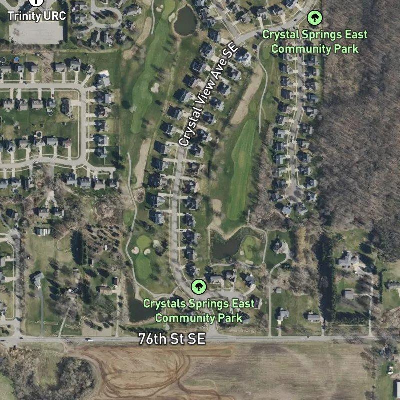 The Fairways sits on 15 acres of meticulously gridded lots—each one a third of an acre, the kind of tight geometry that makes the whole place feel like someone actually planned it—and homes here run around $625K. You're about 17 minutes from downtown Grand Rapids and a quick 13-minute shot to Gerald R. Ford airport, which matters if you travel. Crystals Springs East Community Park is practically across the street (two minutes on foot), and there are two parks within a mile if you need options. The nearest grocery is a mile out, restaurants dot the area within walking distance, and you've got 24 dining spots within a mile when you're tired of cooking. Cross Creek Charter Academy serves the schools here. This is the Hanna Lake Ave & 76th St Area, the kind of subdivision where every street looks deliberate because it is.