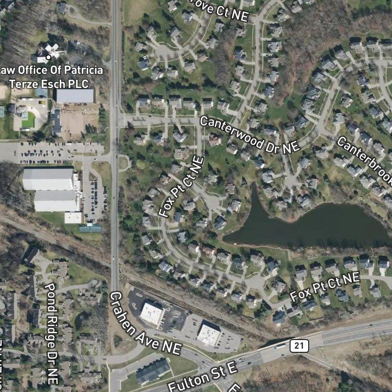 Sitting just off Leonard and Crahen in the heart of West Michigan, The Orchard'S spreads across 22 acres with homes built on generous 0.40-acre lots—enough space to breathe without feeling isolated. Downtown Grand Rapids is an easy 11 minutes away, and you're about 17 minutes from Gerald R. Ford Airport, which makes the whole region feel accessible without the constant hum of it in your backyard. Forest Hills Park sits a mile down the road, and Hidden Lake is another half-mile beyond that, so there's real green space within reach. The median home price hovers around $779K, and you've got a half-dozen grocery stores within two miles, plus restaurants and coffee shops scattered nearby—nothing feels far. Forest Hills Public Schools serves the area, and the whole subdivision has that settled, tree-lined character that comes from thoughtful lot sizes and proximity to both water and everyday amenities without being cramped into the city itself.