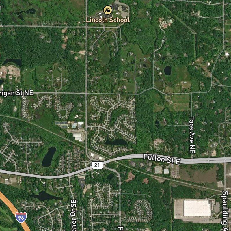 Every morning here starts with more space than you'd expect—70 acres of subdivision land where the lots breathe, and the drive to downtown Grand Rapids clocks in at just under 12 minutes when you actually need the city. Homes run around $890K, which buys you enrollment in Forest Hills Public Schools and proximity to Hidden Lake about a mile and a half south, plus Forest Hills Park even closer. A grocery store sits 1.3 miles down the road—six options within two miles if you're the comparison-shopping type—and the same distance gets you to dinner, though the coffee shop requires a bit more of a pilgrimage at 1.8 miles. Gerald R. Ford Airport is 17 minutes away, which means you're not wrestling with a cross-county drive before dawn, and the whole setup keeps you tethered to the Leonard St & Crahen Ave Area without feeling pinned to it.