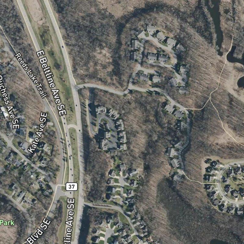 The entrance to this condo community sits along the East Beltline corridor, where tree-lined streets and newer construction signal a pocket of deliberate development. Nine acres of residential space spreads across the property, with units oriented to take advantage of the mature landscape that defines the area. Reeds Lake sits less than a mile away, close enough that the water views and natural setting inform the character of the place without overwhelming it. Downtown Grand Rapids is twelve minutes south; the airport is fifteen minutes north. Shopping and dining cluster nearby—a dozen restaurants within walking distance of the community, and twenty-four grocery stores within two miles—so daily errands don't require much planning.