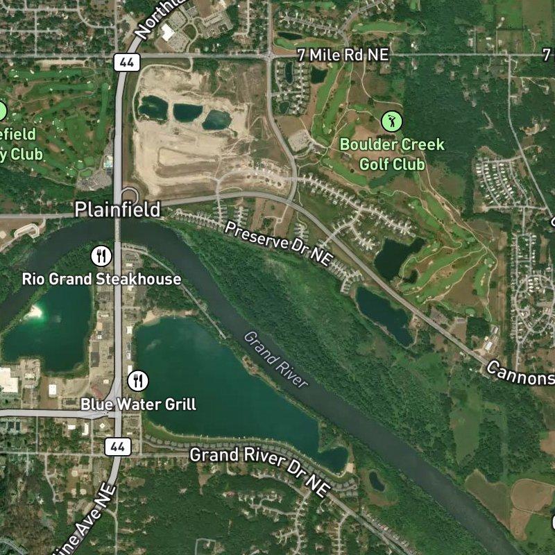 Early morning here is something special—the light hits the stone and HardiPlank facades just right as the Grand River slides past, and you realize why 119 acres along the water made sense for a place like this. Homes run around $718K, and they're ranch-style with real substance, the kind that sits quietly on its lot rather than announcing itself. Downtown Grand Rapids is about 18 minutes away, which means you're close enough to catch dinner out without the commute feeling like work, and the airport is roughly 27 minutes if you need it. Within a mile you've got 66 restaurants to choose from—a three-minute walk gets you to the nearest one—plus a grocery store nine minutes on foot and a coffee shop eight minutes out, so the daily errands don't require a planning session. Versluis Park is a short walk away, and there are four parks within a mile of the community, with Versluis Lake itself just a third of a mile down the road if you want to be near water. The Northview Public Schools district serves the area, and you're situated in the grand-river-dr-east-beltline-ave-area part of the region. If you've got a boat, the Rogue River Mouth Launch is less than a mile away—real access, not the theoretical kind. It's the kind of place where you can actually live without overthinking every move.