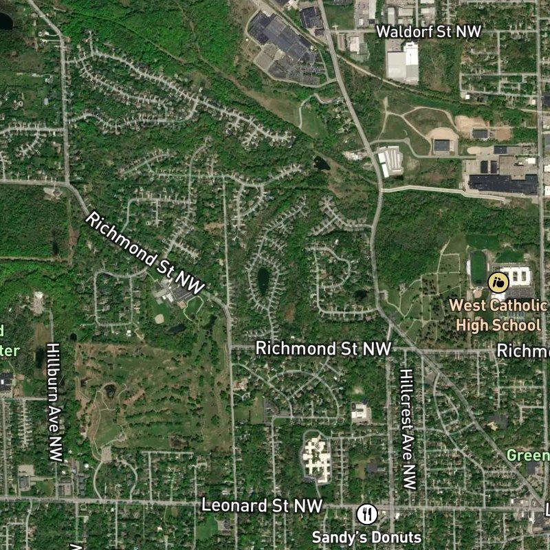 You're looking at The Villas of Oakleigh Woods during that golden hour just after sunrise or in late afternoon when the light hits the mature trees just right. That's when you really see what's going on here—fifty-six acres of thoughtfully spaced condos in a part of Grand Rapids where the lots actually breathe. The neighborhood has that established, quiet feel, with winding roads and big trees that make you forget you're just twelve minutes from downtown. There's a grocery store less than a mile away, and half a dozen restaurants within walking distance if you're willing to stroll, plus three parks close enough that you don't need to plan an expedition. The Highlands is a pleasant walk away if you want a quick green space fix.