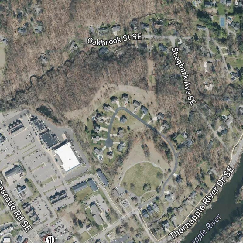 You'll find Thornapple Centre Site Condominiums spread across 12 acres in the Cascade Road and Burton Street area, where the built environment feels unhurried without being remote—you're roughly 20 minutes from downtown Grand Rapids and about 15 minutes from Gerald R. Ford Airport, which means the city is close but doesn't intrude. The condos themselves sit on generous lots averaging two-thirds of an acre each, and there's real convenience woven in: a grocery store is a three-minute walk, a coffee shop equally close, and a restaurant within the same distance. Leslie E. Tassell Park is a short walk away if you want to stretch without leaving the neighborhood, and there are two other parks nearby as well. The dining scene around here has some actual depth—42 restaurants within a mile gives you real choice rather than the usual defaults.