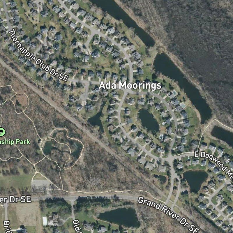What catches people off guard about this place is how much breathing room fifteen acres gives you while keeping you close to everything. Thornapple Club sits on generously spaced lots—averaging about a third of an acre each—that feel genuinely private without the isolation. Ada Township Park is a three-minute walk away, and eight parks scatter within a mile, so there's always somewhere to move around. You're about nineteen minutes from downtown Grand Rapids and just under twenty from Gerald R. Ford Airport, which means the city is right there when you need it, but the condo community itself has its own rhythm. A dozen restaurants and half a dozen grocers are within a mile or two, and the Grand River boat launch sits less than a mile away if you're the type to get on the water.