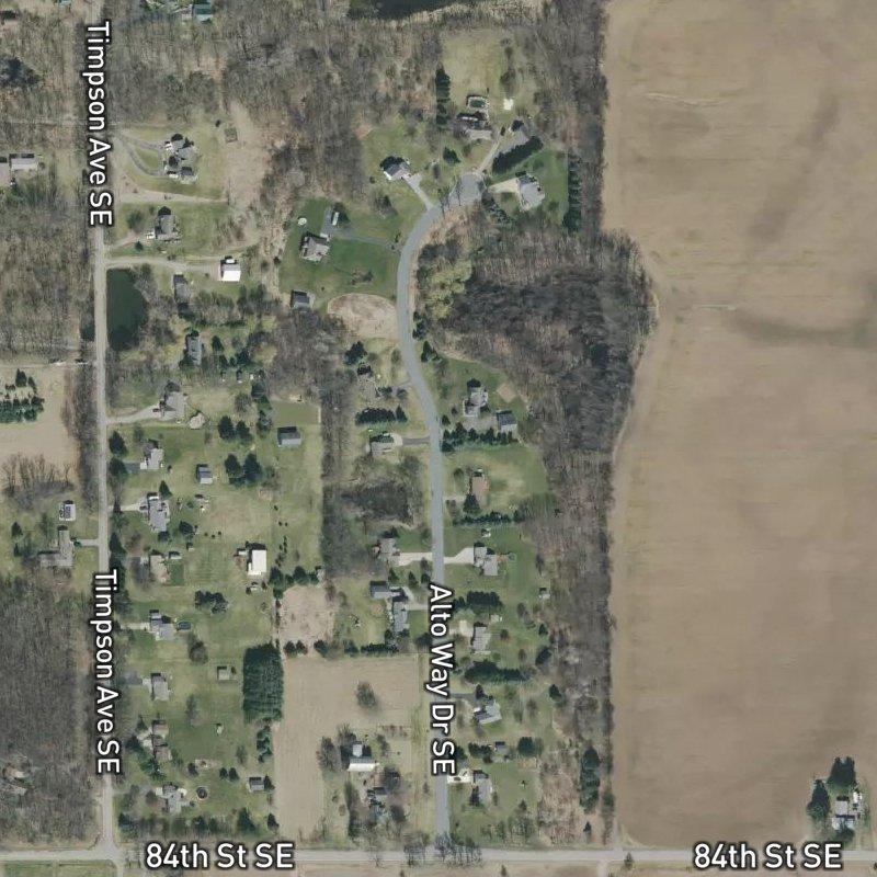 Timpson Estates No. 2 sits on 44 acres where lots average nearly two and a half acres each—the kind of breathing room that means you're not counting your neighbor's garden from your porch. Spring Lake is barely a quarter mile away, close enough that the water is genuinely part of your geography here, and Campbell Lake's public access point is just over two miles down the road if you want to launch a boat. Homes run around $461K, with Gerald R. Ford Airport a straightforward 17.8-minute drive when you need it, while downtown Grand Rapids lands at a reasonable 31.5 minutes. The nearest restaurant is about two miles out, so you're trading walkable convenience for land and some quiet—a fair trade for a lot of people. Lowell Area Schools serves the subdivision, which sits within the 68th St & Morse Lake Ave Area.