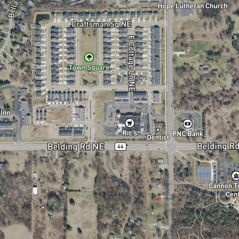 So there's this detail that sounds minor but actually matters—the grocery store is literally steps away, which means if you forget milk on a Tuesday night, you're not making a drive. Town Square Commercial East sits on 5 acres in the Rockford Village Builders Plat Area, and the whole setup is built around that kind of convenience. You've got 24 restaurants within a mile, so dinner options range from a 4-minute walk to whatever you're feeling on a given night. Silver Lake is less than a mile away if you want to get out on the water, and Town Square park is a quick 3-minute walk for when you need some air. The condo market here runs around what you'd expect for the area, with homes in the mid-range, and you're looking at about 24 minutes to downtown Grand Rapids when you need the city energy.