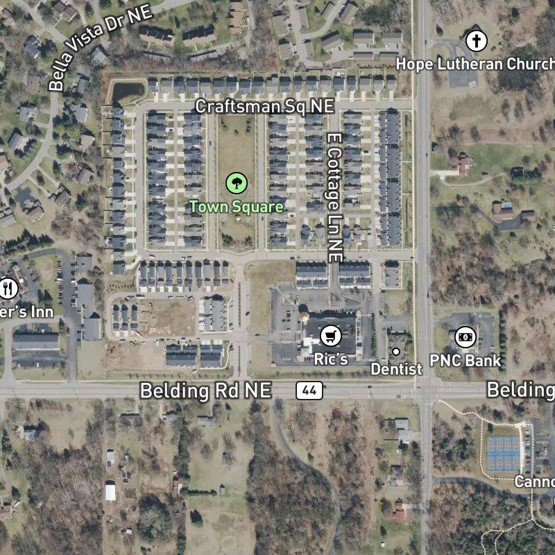 What surprises people about this place is how walkable the immediate surroundings actually are—you can grab groceries steps away, hit a restaurant in two minutes, and there's a park right across from your door. The whole community sits on six acres with the Town Square at its heart, meaning you're never far from something to do without getting in the car. Homes here run around $343K, and they're part of the Rockford Village Builders Plat Area, a pocket of Rockford Public Schools that lands about 24 minutes from downtown Grand Rapids if you need to head that way for work or a night out. Silver Lake is less than a mile away, and downtown Rockford itself has a decent spread of restaurants—24 within a mile—so whether you're craving a quick weeknight dinner or exploring something new, the options are there without much hunting around.