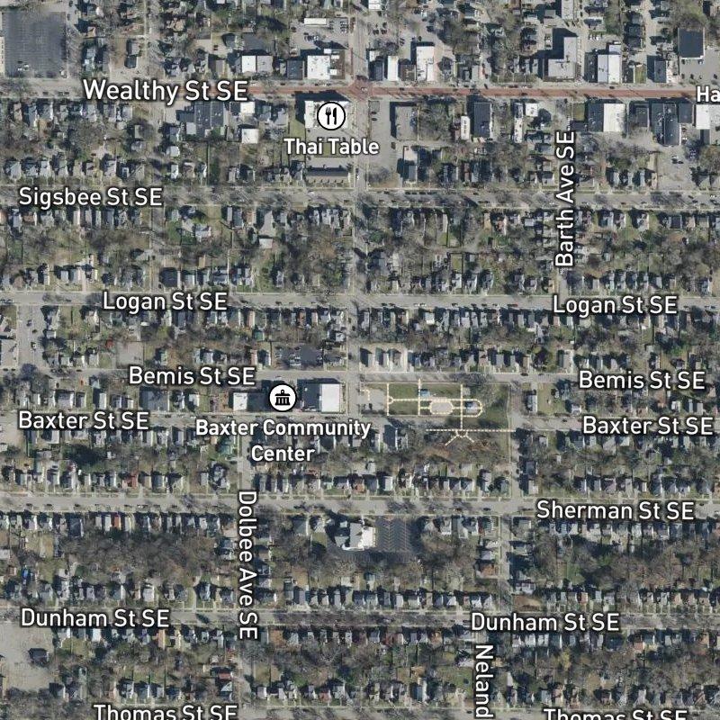 Early morning here is when you notice the bones of the place—tree-lined streets and the brick Craftsman homes that line them, before the day fills in the rest. Van Leeuwens Add. sits right in Baxter, just steps from transit and close enough to downtown Grand Rapids that you're there in five and a half minutes, yet removed enough that the subdivision itself stays residential and scaled. The 6-acre platted area has tight lots—about 0.09 acres each—which keeps things compact, and homes run around $149K. What makes it work is proximity: groceries, coffee, and restaurants are all a three-minute walk, and Joe Taylor Park sits adjacent, so you're not choosing between green space and convenience. Grand Rapids Public Schools serves the area, and dining options number in the hundreds within a mile. It's the kind of tight, walkable setup where you can actually run errands on foot and mean it.