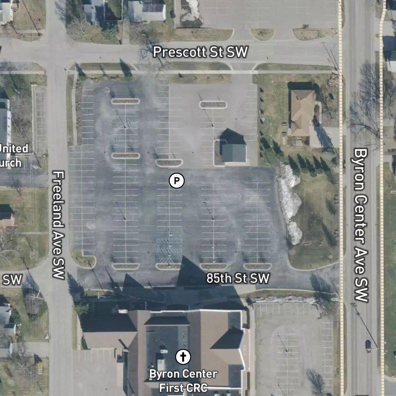This three-acre plat sits on the east side of the Marlo Farms Area, where 85th Street runs past modest lots and neighborhood-scale development. Downtown Grand Rapids is eighteen minutes west, and the airport roughly twenty-two minutes south—close enough that you're not stranded, far enough that traffic noise stays somewhere else. The immediate surroundings are mixed residential and commercial, with Byron Township Bicentennial Park a ten-minute walk away.
