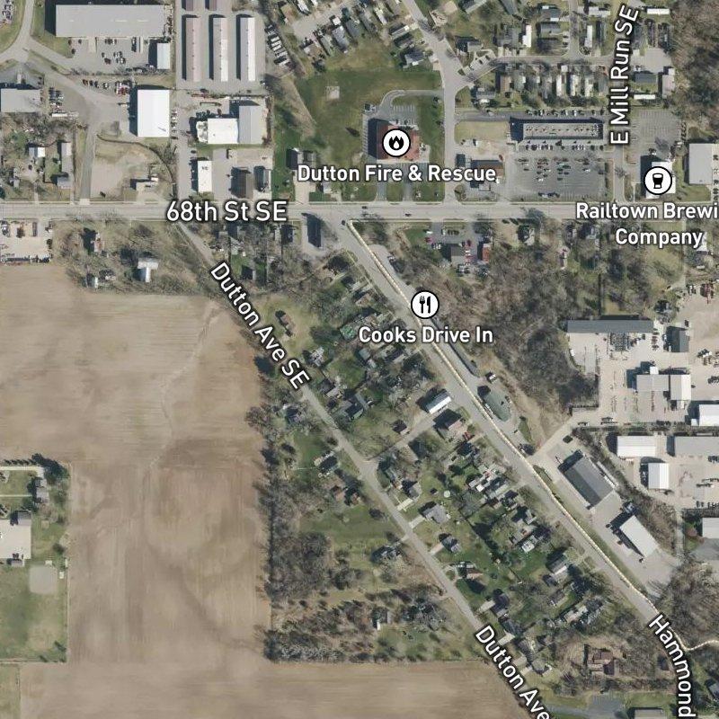 It's an 8-acre platted subdivision with tight 0.3-acre lots that pack a surprising number of homes close together—the kind of layout where you're basically a neighbor's breadbox away from everyone else. Homes run around $271K, and you've got a restaurant literally steps away and a dozen more within a mile, which is pretty good density for this part of West Michigan. Caledonia Community Schools handles the schools, and Gerald R. Ford airport is just under 10 minutes out, so quick trips are doable. Downtown Grand Rapids hits around 20 minutes if you head that way. Dutton Shadyside Park is about a 12-minute walk, and there are two parks within a mile to break things up.